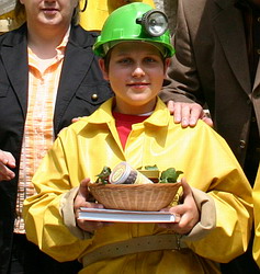 Der 11-jährige freute sich sehr über das Geschenk, er erhielt einen Gutschein vom Förderverein. Mit acht Personen darf er wieder in die Grube Wenzel kommen. Das freute ihn sehr und als er vom Gemeindeoberhaupt auch noch das Buch der Gemeinde und von Familie Kury, den Nachbarn der Grube, einige Leckereien erhielt, führte das zu lautem Jubeln seiner Klassenkameraden.