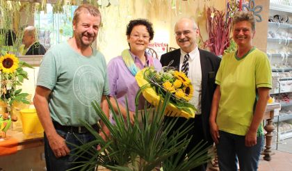 Alle Gutscheine nahmen an Wochenziehungen und an der Hauptziehung teil. Letztere hat Alexandra Himmelsbach aus Haslach gewonnen. Freudig holte sie sich ihre Haslacher Geschenk-Schecks im Wert von 100 Euro, bei dem Geschäft, in dem sie die Schlafgutscheine eingelöst hatte, ab. Es war dies die Gärtnerei Göppert in Haslach-Bollenbach. Alexandra Himmelsbach hat den Schlafgutschein bewusst eingesetzt, um ihrem frisch renovierten Haus in der Hofstetter Straße mit Kübel- und Balkonpflanzen auch eine grüne Renovierung zu gönnen. Martin Schwendemann übergab den HGH-Gutschein, Albert Göppert (links) überreichte der sympathischen Haslacherin zusammen mit einem wahren Urgestein der Firma Göppert, Zierpflanzengärtnerin Sigrid Bächle (rechts), einen prächtigen Blumenstrauß und eine „vom Saatkorn weg sechs Jahre in Bollenbach gezogene Hanfpalme“ zur weiteren Hausverschönerung. Die nächste Schlafgutscheinaktion des Handels- und Gewerbevereins wird wieder im Juni des kommenden Jahres stattfinden.