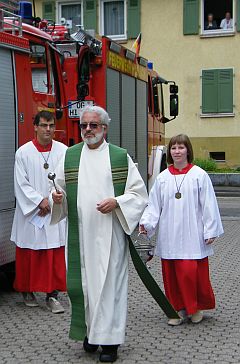Abschließend zog er in Begleitung der Ministranten mit dem Weihwasserkessel durch die geparkte Fahrzeugmenge und segnete Fahrzeuge und Fahrer.