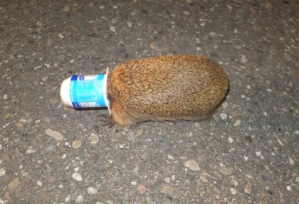 Der Igel hatte seine Nase zwar in Dinge gesteckt, die ihn nichts angehen. Allerdings nur deshalb, weil der Joghurtbecher achtlos weggeworfen worden ist.